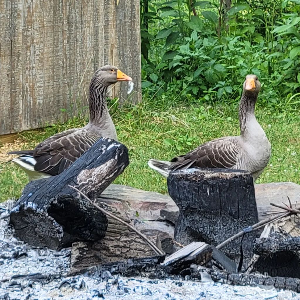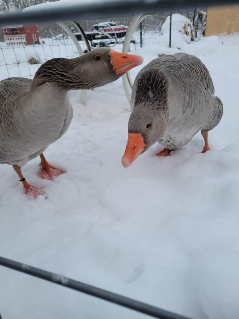We have a beautiful pair of Toulouse geese, Gideon and Gretchen. Gretchen has been laying eggs and Gideon is guarding them ferociously. We are excitedly anticipating goslings on the farm this spring!